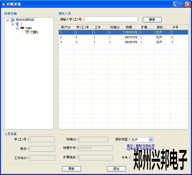 1.選擇終端,在右列表框中可顯示出該終端下的所有授權(quán)人員的名單。或者在請輸入學(xué)(工)號右邊的文本框中錄入所要更改權(quán)限的學(xué)工號,單擊搜索按鈕可在列表中查詢出該人員的授權(quán)信息。
