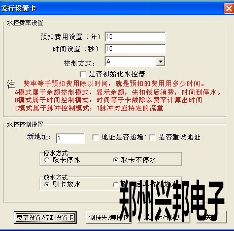 3. 水控控制設置可以更改水控機的機器號還有流水方式和停水方式;如果想更改水控機的機器號必須選擇是否重設地址;地址是否遞增,當勾選上時,機器每刷一次控制卡機器號就會增1;根據所需設置好后,點擊費率設置/控制設置卡,選擇控制設置卡即可;只更改流水/停水方式時,在機器上刷控制卡時顯示9 10 ok,如果更改機器號,刷控制卡時顯示8 9 10 ok。