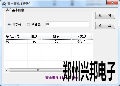 用戶使用卡片丟失需要在一卡通綜合管理平臺中對卡片進行掛失,掛失操作可以保證不被別人使用,保證存款安全。對卡片掛失后必須聯機自動或手動下載全量名單到機器上,此卡在機器上使用時才會出現4-err錯誤,必須進行解掛后才能使用。在卡管理中右鍵點擊掛失操作,會出現如下圖信息,輸入學號或者姓名點擊查詢,雙擊查詢到的信息,選擇掛失原因后點擊確定后就完成了對此卡的掛失操作