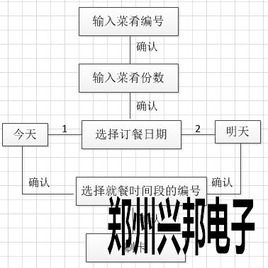 簡易模式下訂餐操作方法:輸入菜肴編號,點擊[確認(rèn)]后輸入菜肴份數(shù),點擊[確認(rèn)]后選擇訂餐日期(今天或者明天),點擊[確認(rèn)]后選擇訂餐的時間段(共有12個時間段),輸入時間段編號點擊[確認(rèn)]后,顯示訂餐的菜肴名稱、份數(shù)和總額,將卡放到刷卡區(qū),聽到滴的一聲響后即可訂餐成功,操作流程如下圖所示: