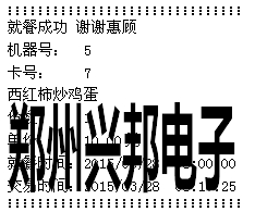 計算模式下按‘+’號鍵可進行取餐,取餐時將需要取餐的卡放到刷卡區,消費機可自動讀取卡片上的訂餐信息,并將其顯示出來,按‘+’號鍵可翻頁查看訂餐信息,按‘確認’可進行取餐,取餐成功后會顯示就餐成功、菜肴名稱、份數、扣費金額,若連接的有打印機,可打印取餐信息,打印的格式如下圖所示:
