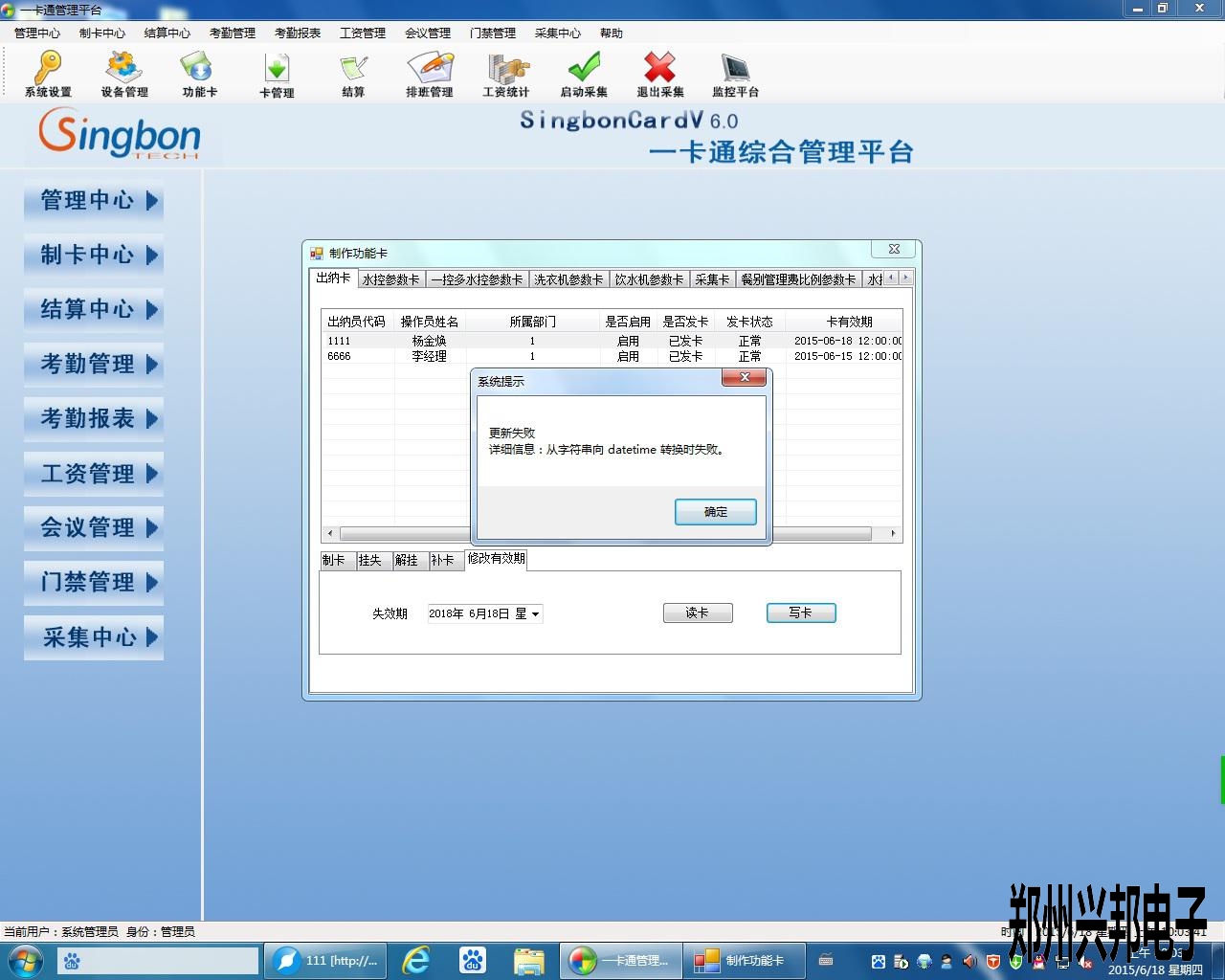 有客戶反應(yīng),在使用食堂消費(fèi)機(jī)軟件時(shí)登錄出納卡的時(shí)候提示己過有效期,進(jìn)入軟件修改有效期的時(shí)間出現(xiàn)了報(bào)錯(cuò),出現(xiàn)了更新失敗,從字符串向datetime轉(zhuǎn)換失敗。這是什么情況造成的呢?
