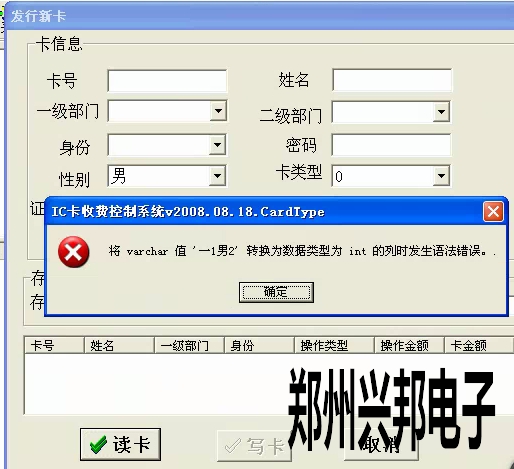 客戶使用的是我們的局域網(wǎng)一卡通食堂售飯機(jī),在使用我們軟件時(shí),新卡無法發(fā)行,在發(fā)行新卡的時(shí)候出現(xiàn)了將varchar值‘一1男2’轉(zhuǎn)換為數(shù)據(jù)類型為int的列時(shí)發(fā)生語法錯誤。