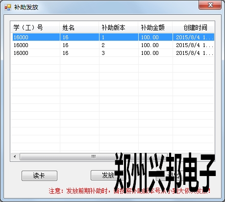 ? 首先點(diǎn)擊讀卡,讀卡后會(huì)按補(bǔ)助的版本號顯示出這張卡所有未領(lǐng)取的補(bǔ)助,領(lǐng)取過的不顯示,發(fā)放補(bǔ)助時(shí),按照補(bǔ)助的版本號從小到大依次發(fā)放,發(fā)放的時(shí)候選中要發(fā)放的補(bǔ)助,然后點(diǎn)擊發(fā)放即可。