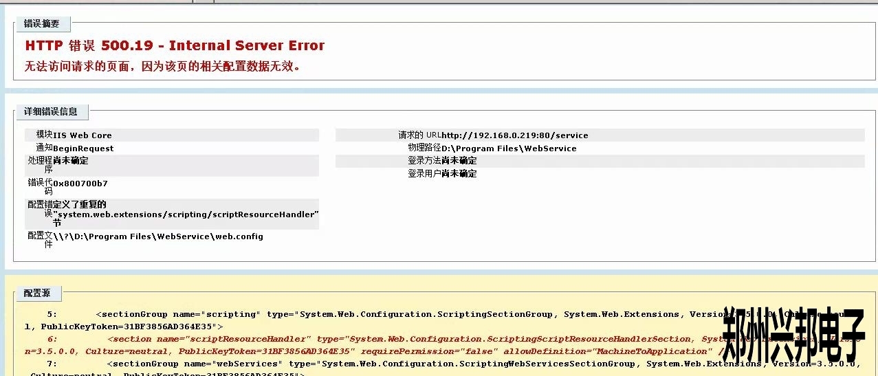 [文章內容簡介]:客戶使用的互聯網一卡通食堂售飯機,在裝好軟件后配置有誤,瀏覽service時提示應用程序中的服務器錯誤.
