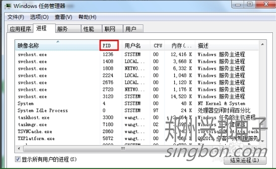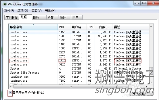 這樣我們就看到了PID這一列標識,看一下2720對應的進程是誰,如果沒有,我們把下面的顯示所有用戶的進程前面的勾打上,就可以看到了,映像名稱是svchost.exe,描述是,Windows的主進程,與上面命令查看的完全一致。