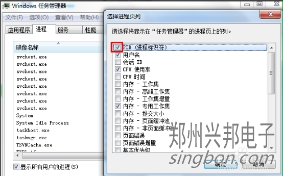 則我們點擊查看--->選擇列,將PID(進程標示符)前面的勾打上,點擊確定
