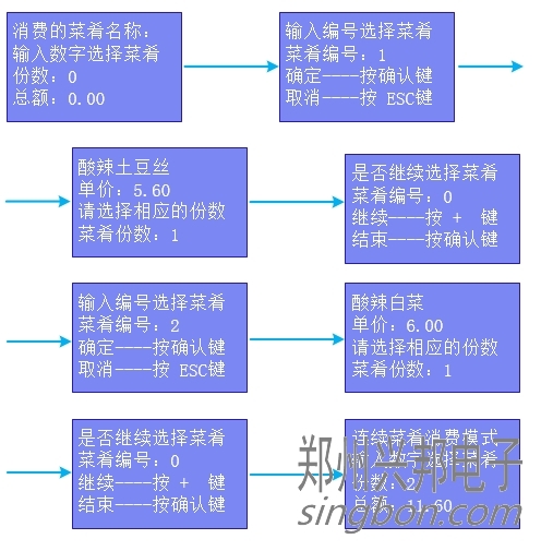 ③ 連續(xù)菜肴消費(fèi)模式:輸入菜肴編號(hào),點(diǎn)擊確認(rèn)后選擇份數(shù),點(diǎn)擊確認(rèn)后出現(xiàn)“是否繼續(xù)選擇菜肴,菜肴編號(hào):0,繼續(xù)----按 + 鍵,結(jié)束----按確認(rèn)鍵”,點(diǎn)擊“+”號(hào),輸入下一份菜肴編號(hào),點(diǎn)擊確認(rèn)后選擇份數(shù),點(diǎn)擊確認(rèn)后出現(xiàn)是“是否繼續(xù)選擇菜肴,菜肴編號(hào):0,繼續(xù)----按 + 鍵,結(jié)束----按確認(rèn)鍵”,點(diǎn)擊確認(rèn),出現(xiàn)消費(fèi)的份數(shù)、總額,將卡片放于刷卡區(qū),即可進(jìn)行扣費(fèi),扣費(fèi)后顯示扣費(fèi)金額、手續(xù)費(fèi)用、卡上余額、卡號(hào),操作流程如下圖所示:
