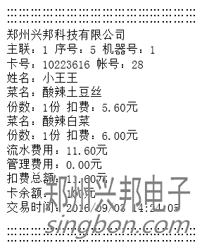 3) 自動(dòng)消費(fèi)模式:最多可設(shè)置8個(gè)費(fèi)率,每個(gè)費(fèi)率可設(shè)置對(duì)應(yīng)的菜肴、份數(shù),將費(fèi)率設(shè)置好之后在自動(dòng)模式下輸入相應(yīng)的費(fèi)率編號(hào)放卡即可自動(dòng)扣除相應(yīng)費(fèi)用。只有計(jì)算和自動(dòng)模式可以用,計(jì)算模式只作為查看使用,不能扣費(fèi)。若連接的有打印機(jī),可打印消費(fèi)明細(xì),打印出來(lái)的消費(fèi)明細(xì)格式如下圖所示: